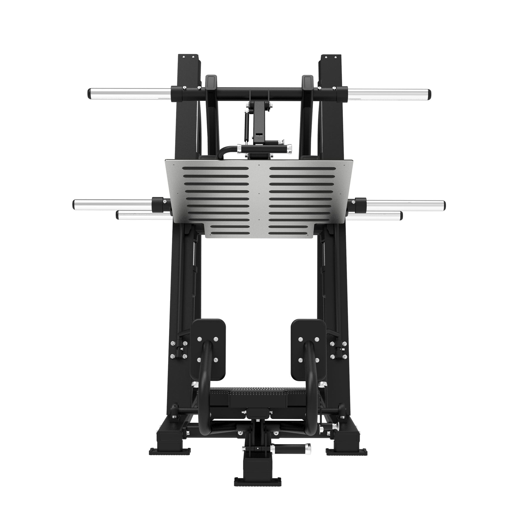 Fabriquée avec une structure en acier renforcé à double tube (50×100 mm et 40×80 mm, 2,5 mm d'épaisseur), elle garantit une stabilité totale même sous des charges intensives. Sa large plateforme antidérapante offre une base solide pour tous types d'utilisateurs, tandis que le dossier ergonomique et le siège rembourré assurent une position confortable et alignée tout au long du mouvement.