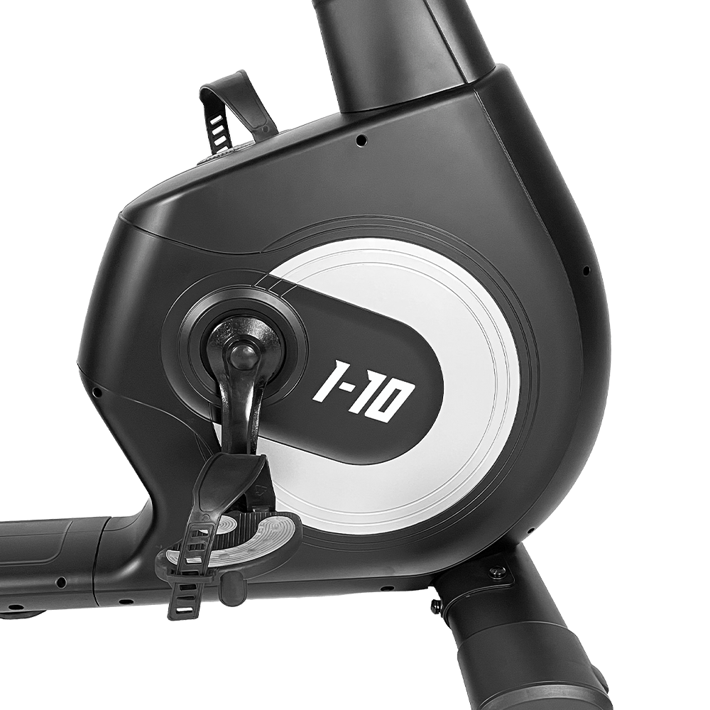 The depth-adjustable seat and its ergonomic backrest allow maintaining a comfortable and safe posture, reducing lumbar tension during prolonged sessions. Thanks to its belt transmission, the I-10 offers continuous, smooth, and maintenance-free pedaling, perfectly adapting to low or high-intensity routines.