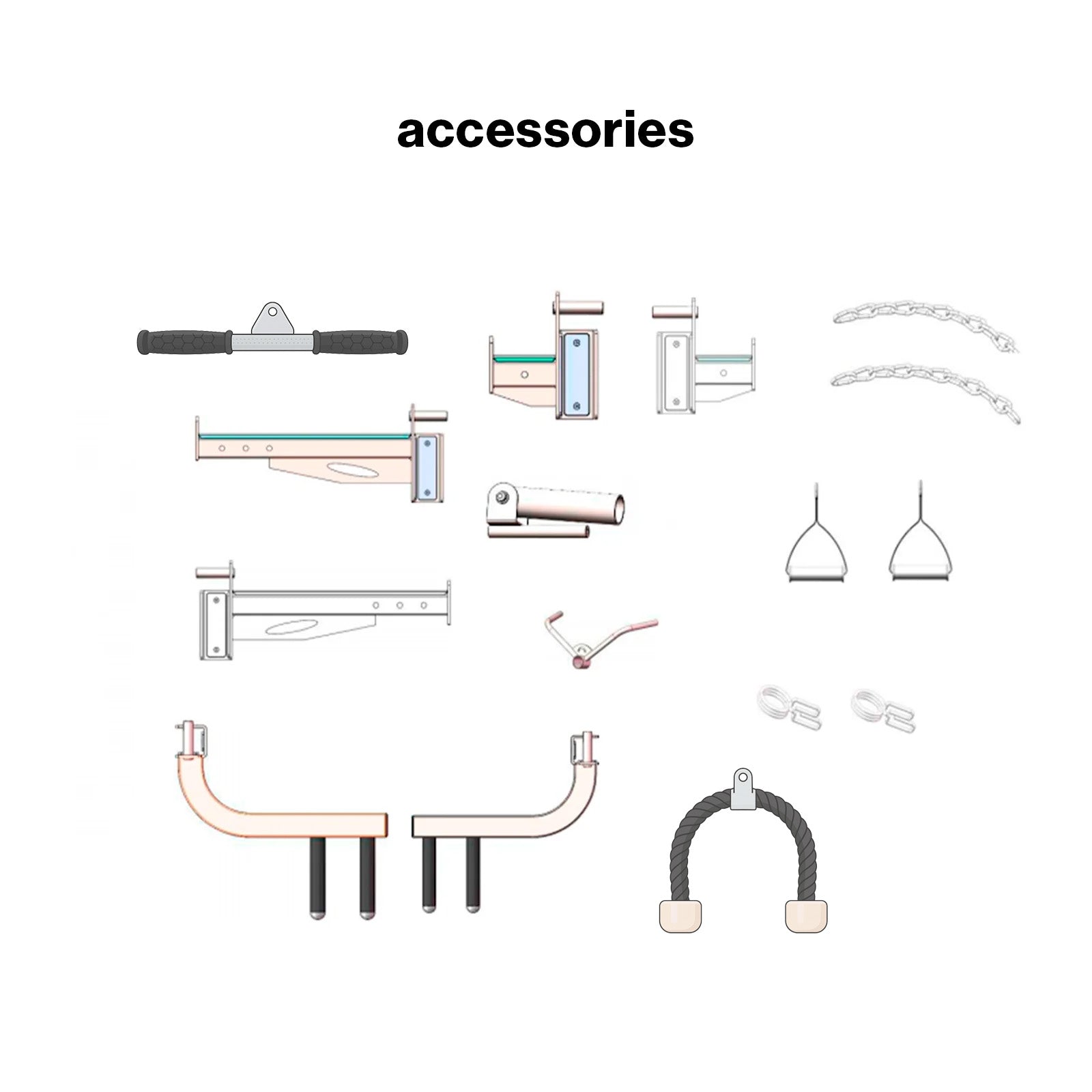 Alle accessoires die op de afbeeldingen te zien zijn, zijn inbegrepen. Inclusief rechte stanggreep, tricepsgreep en greep voor olympische stang en uitvoering van roeioefeningen (landmine).