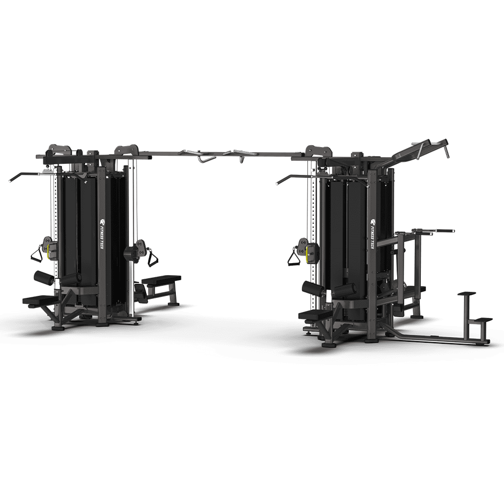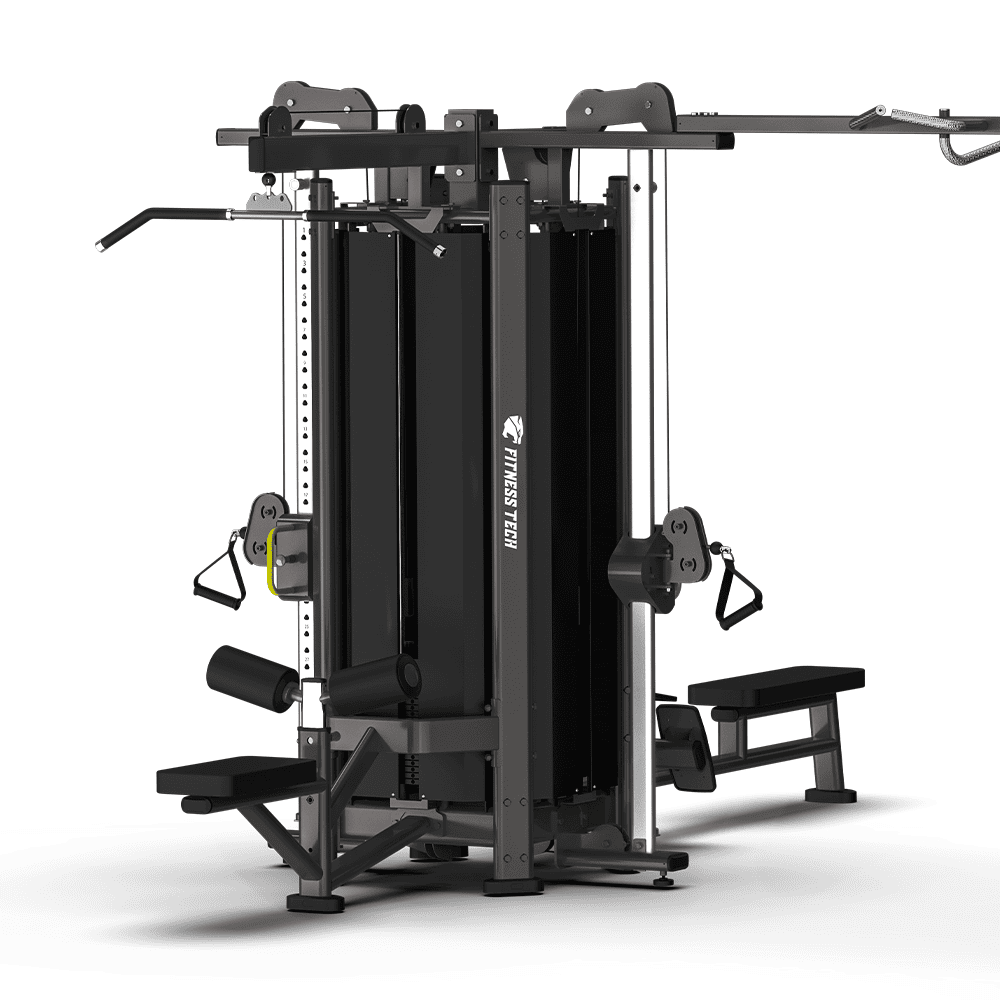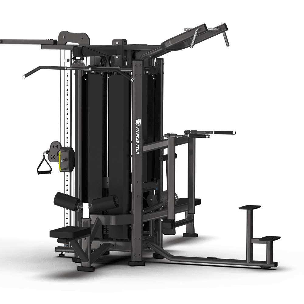 El centro multifuncional de 8 puestos de la línea Pro Series de Fitness Tech está diseñado para ofrecer una solución completa de entrenamiento en espacios profesionales de alto rendimiento. Esta estructura integra múltiples estaciones de trabajo en un solo equipo, permitiendo realizar entrenamientos simultáneos de fuerza y funcionales con la máxima eficiencia, optimizando el uso del espacio en salas fitness con alta rotación de usuarios.