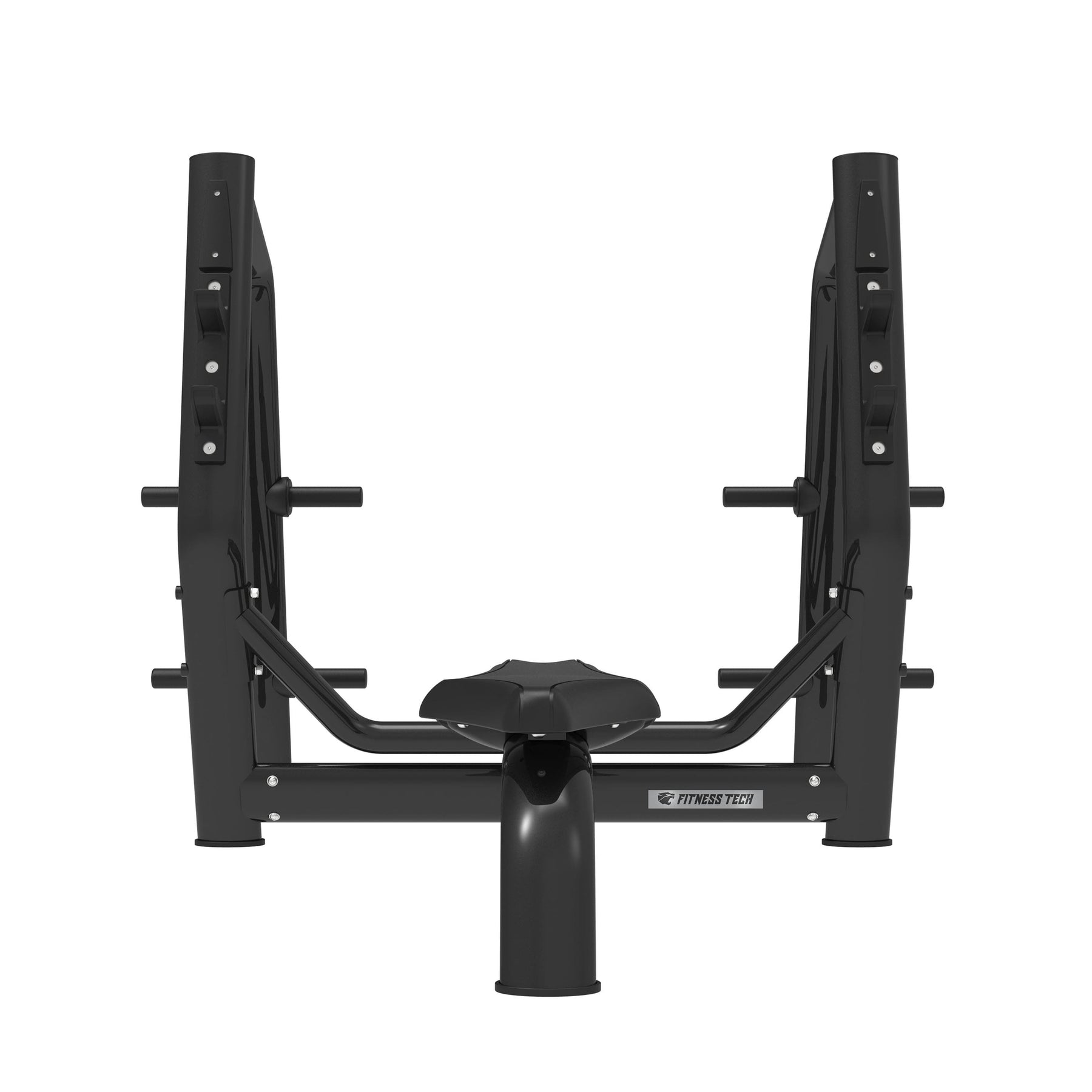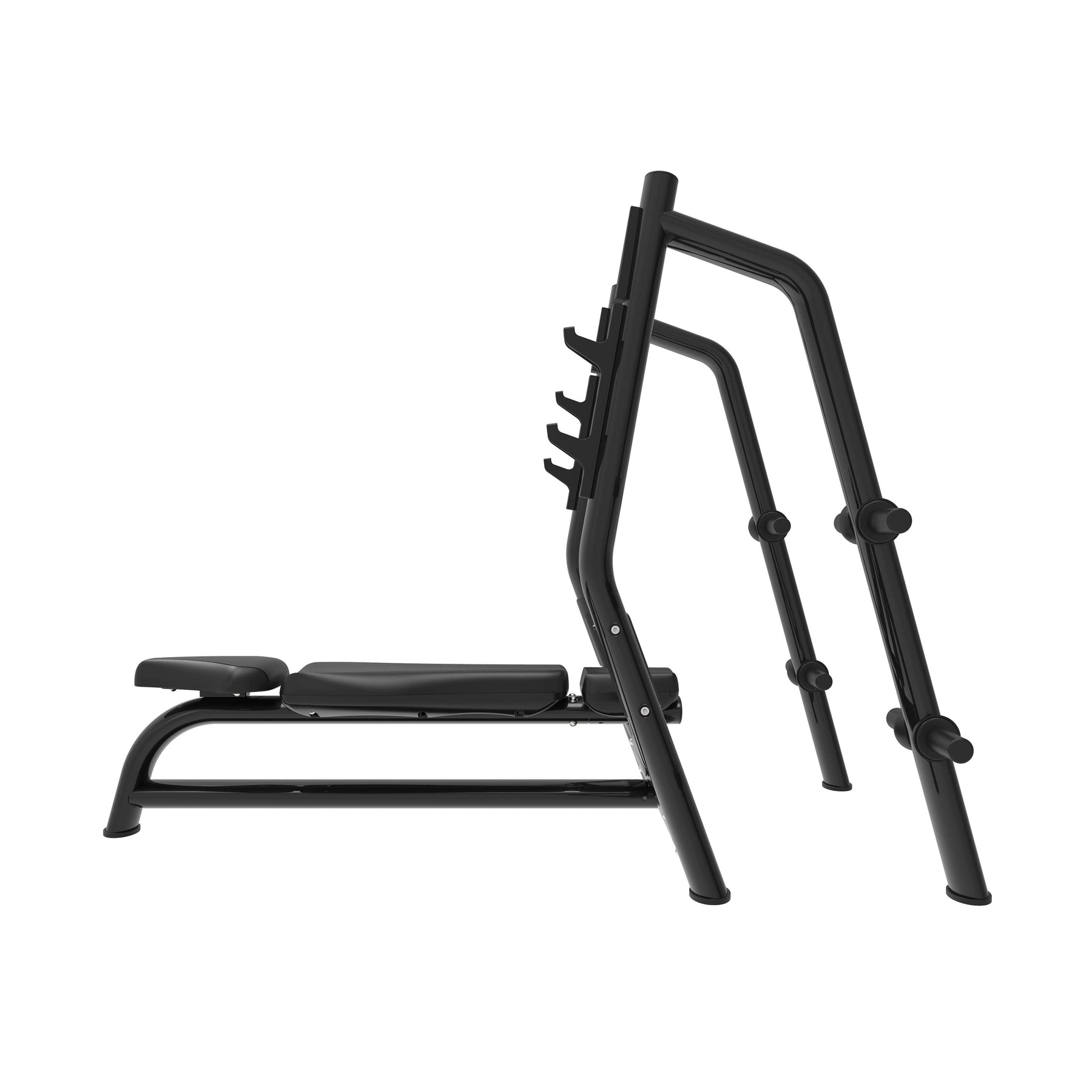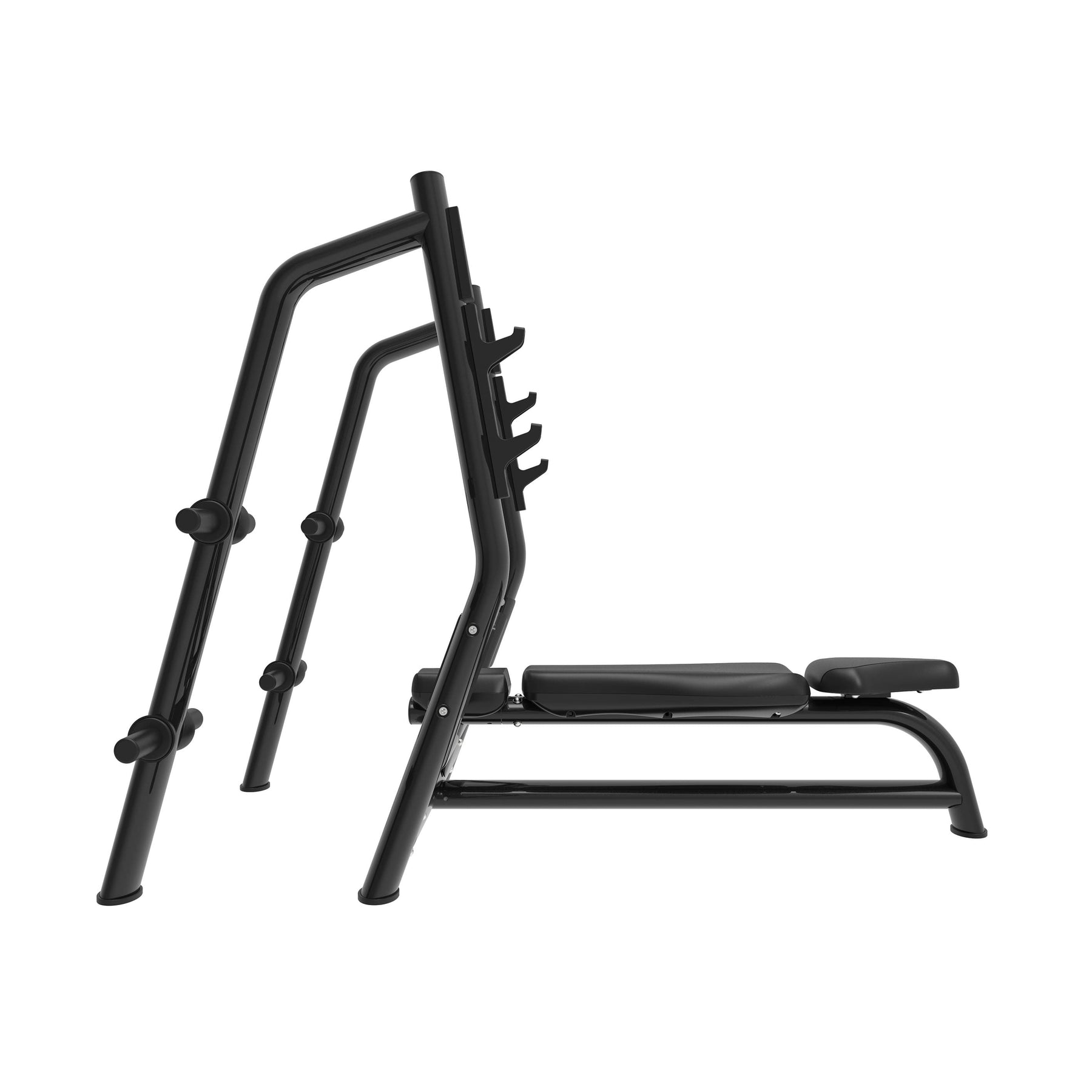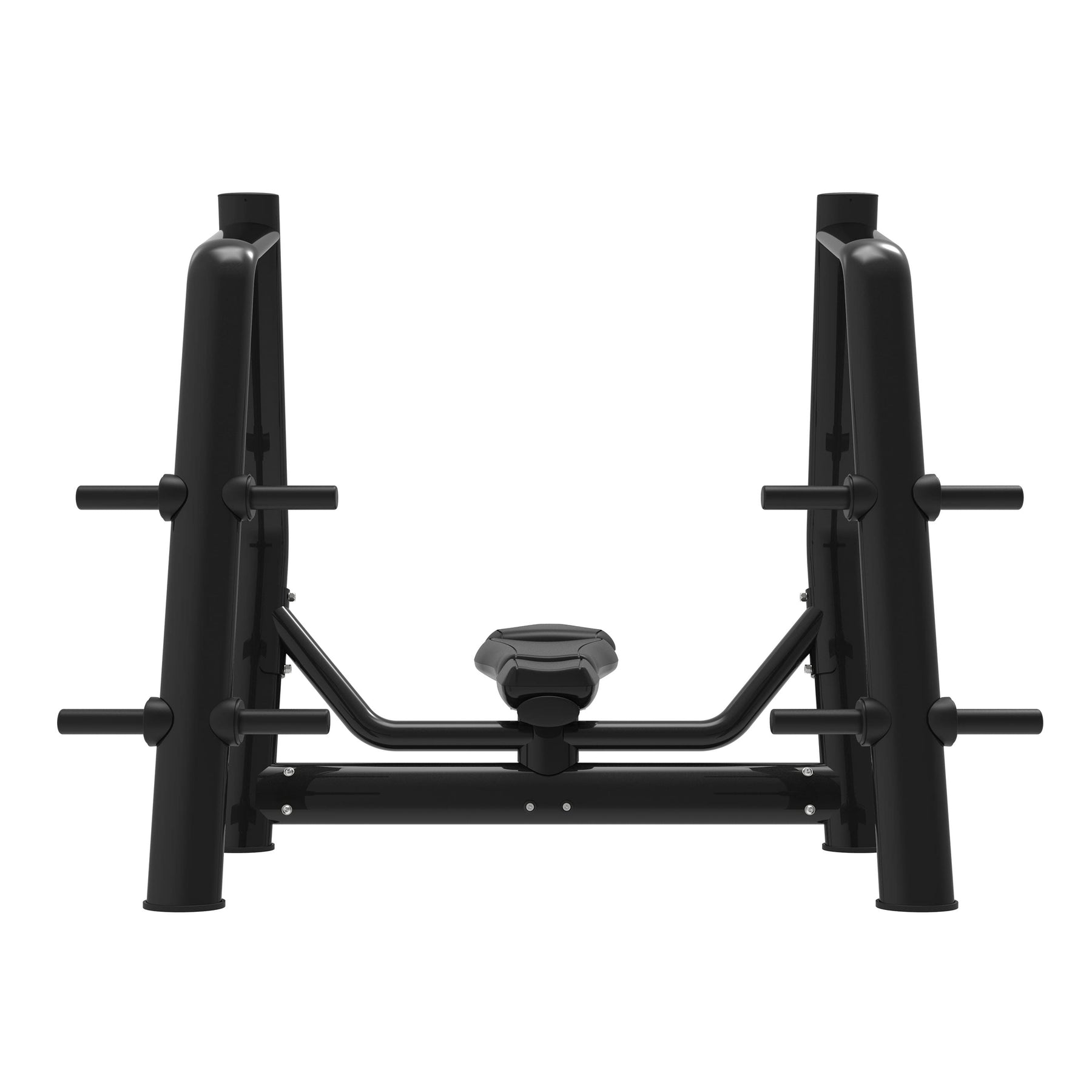 Le banc dispose d'une surface complètement plate et d'un rembourrage haute densité qui procure fermeté et confort, permettant de maintenir une posture technique et stable tout au long du mouvement. Les supports de barre, disposés à différentes hauteurs, facilitent un décollage confortable et un raccrochage sécurisé, s'adaptant au type d'entraînement ou à la taille de l'utilisateur. La zone avant ouverte permet l'assistance d'un spotter, rendant les entraînements intensifs plus sûrs et efficaces.