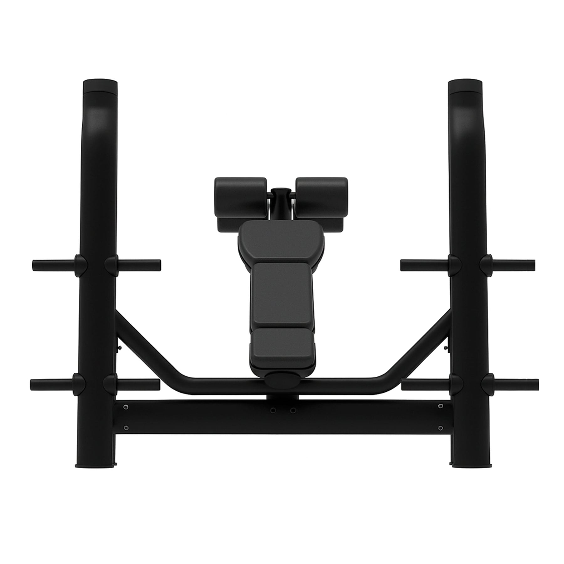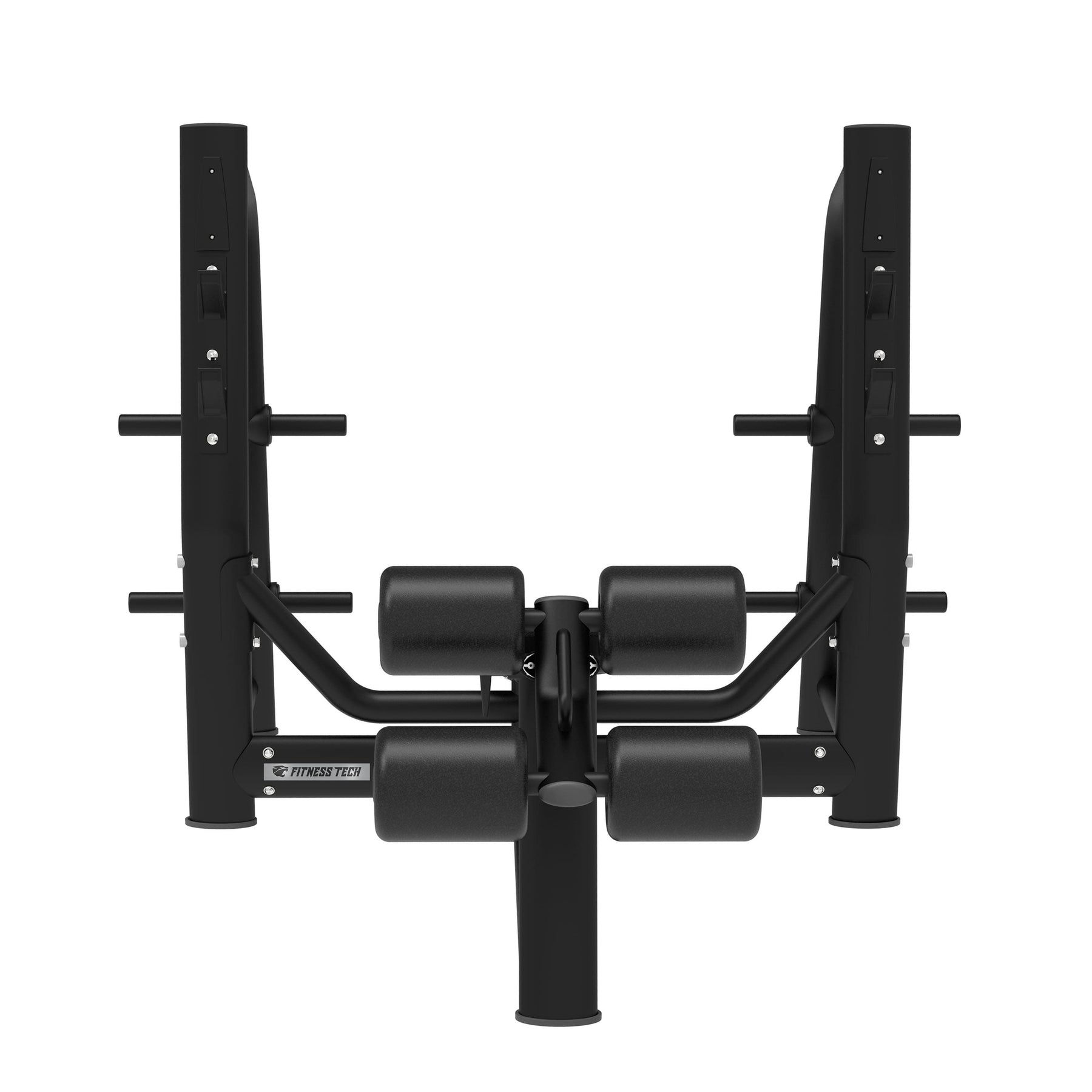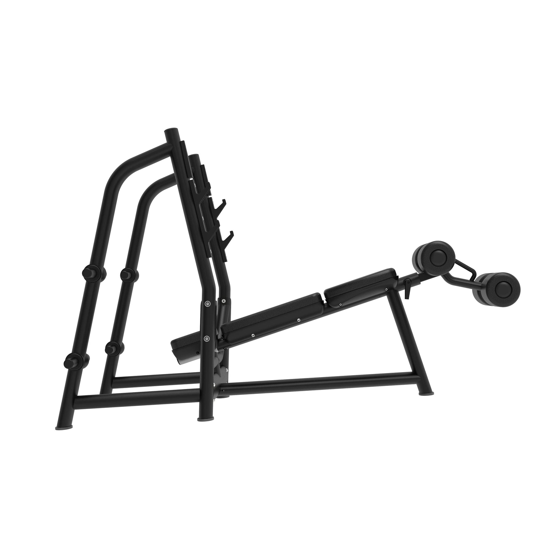 Le dossier décliné et le support pour jambes avec rouleaux rembourrés permettent de maintenir une position ferme tout au long du mouvement, favorisant une technique sûre et confortable. Les supports pour barre, situés à différentes hauteurs, facilitent le décollage et le réaccrochage du poids en toute confiance, tandis que les sorties latérales pour disques permettent de garder la zone de travail toujours organisée.
